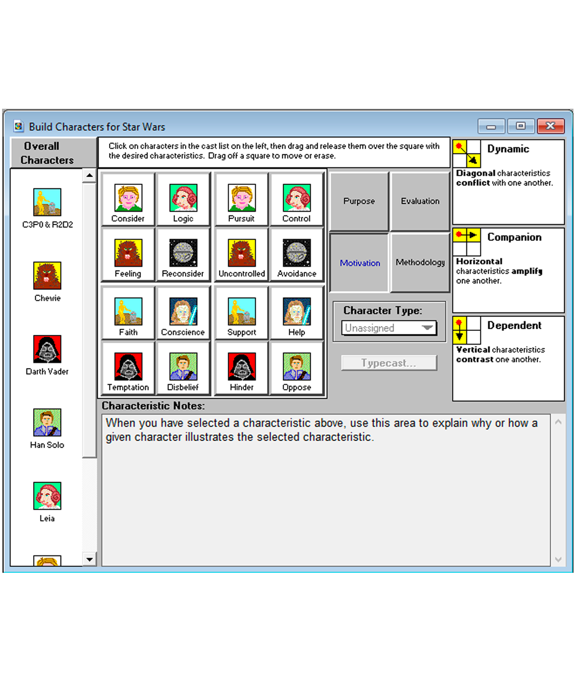 Interesting. Deep. Real. Memorable. Dramatica helps you craft characters that leap off the page and into the hearts and minds of your audience. Define the relationships between your characters by assigning thematic elements to character icons. Explore character relationships and see how they help or hinder each other. Decide what's motivating your characters and how they'll express the central themes of your story.