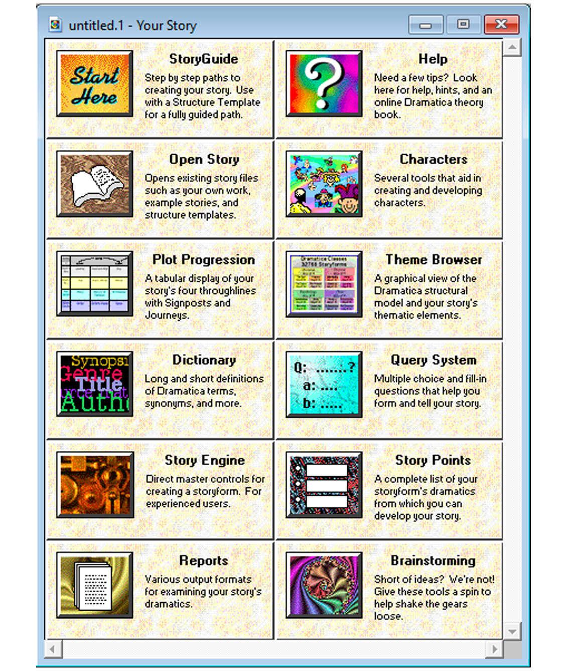 A collection of 12 clickable tiles that activate the key tools in Dramatica.
