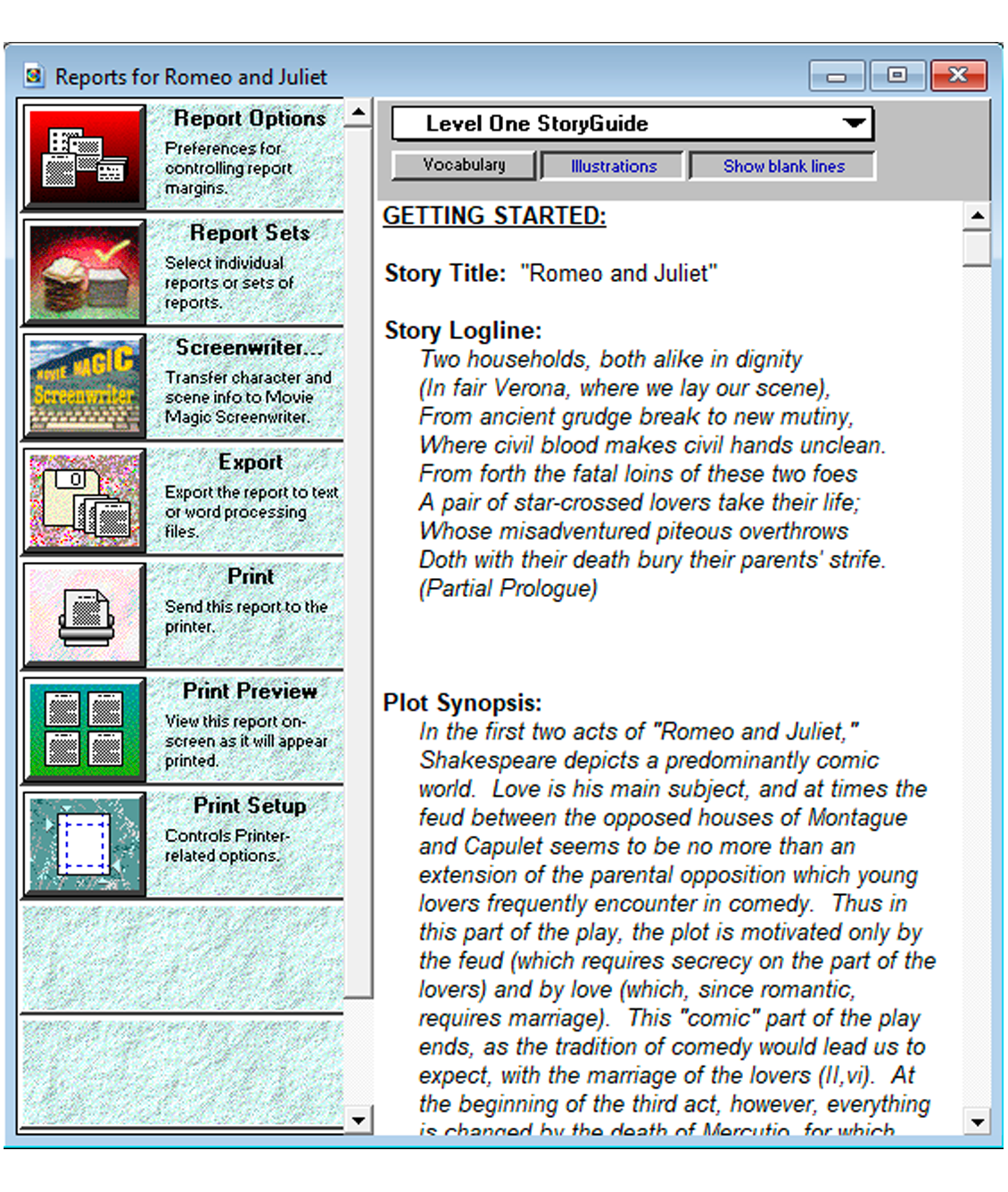 While developing stories in Dramatica Pro is at least half the benefit, another benefit are its reports. Dramatica Pro has over two dozen reports that organize the story elements into readable prose. Some reports focus on character, plot, or theme, while others show an overview of the story's structure and storytelling. The Treatment report shows a beat outline or treatment, which can be exported directly to Movie Magic Screenwriter or Outline 4D. All reports may be printed or exported as text.
