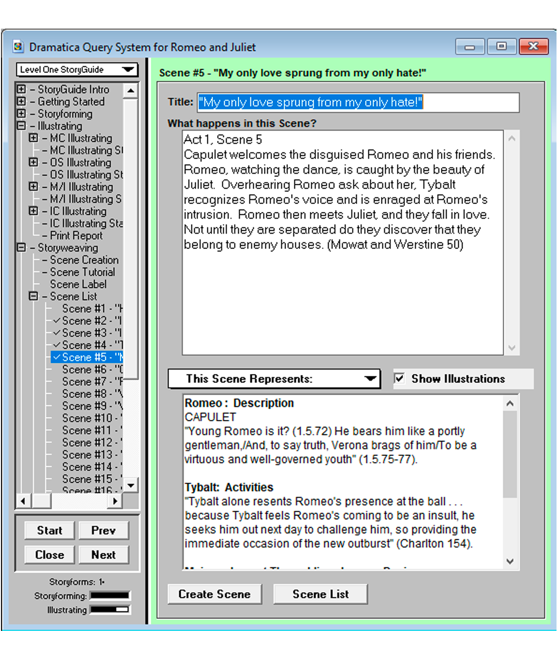 While most of Dramatic Pro is holistic, the StoryGuide leads writers through the process of creating (or analyzing) a story step-by-step. The StoryGuide begins with the story's title, moves through creating characters, developing the plot and themes, and ends up with building a step outline of the story. It has three levels, each level adding depth to the development of the story.
